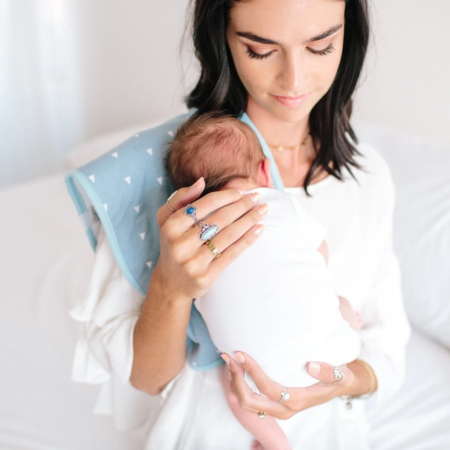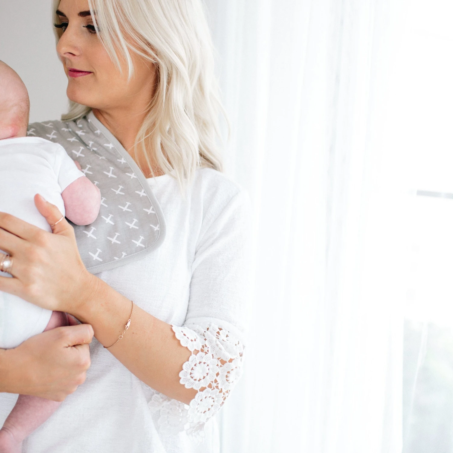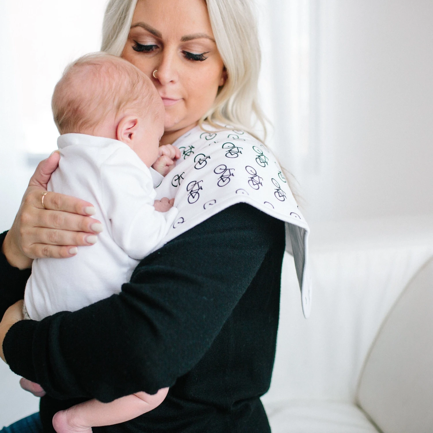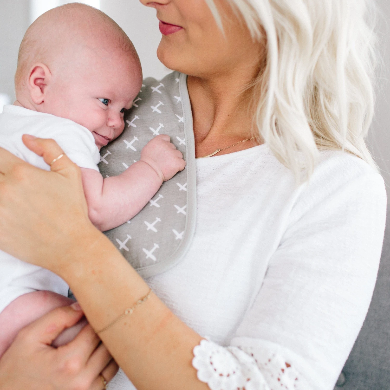 Copper Pearl’s burp cloths are designed with baby’s comfort in mind. That’s why we created them with 100% ultra-soft cotton layers on the front (patterned) and back (plain white). You can feel confident that baby will feel cozy against your shoulder while burping.