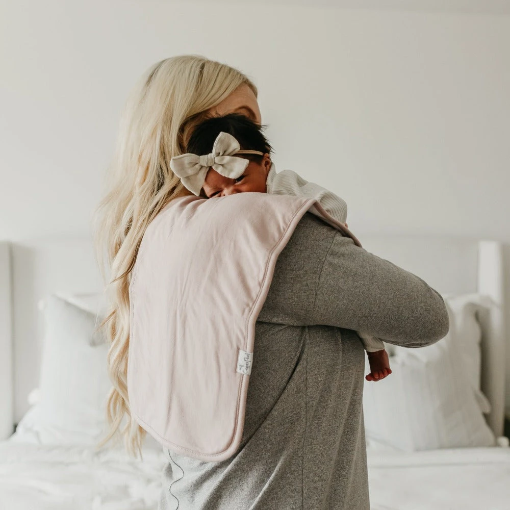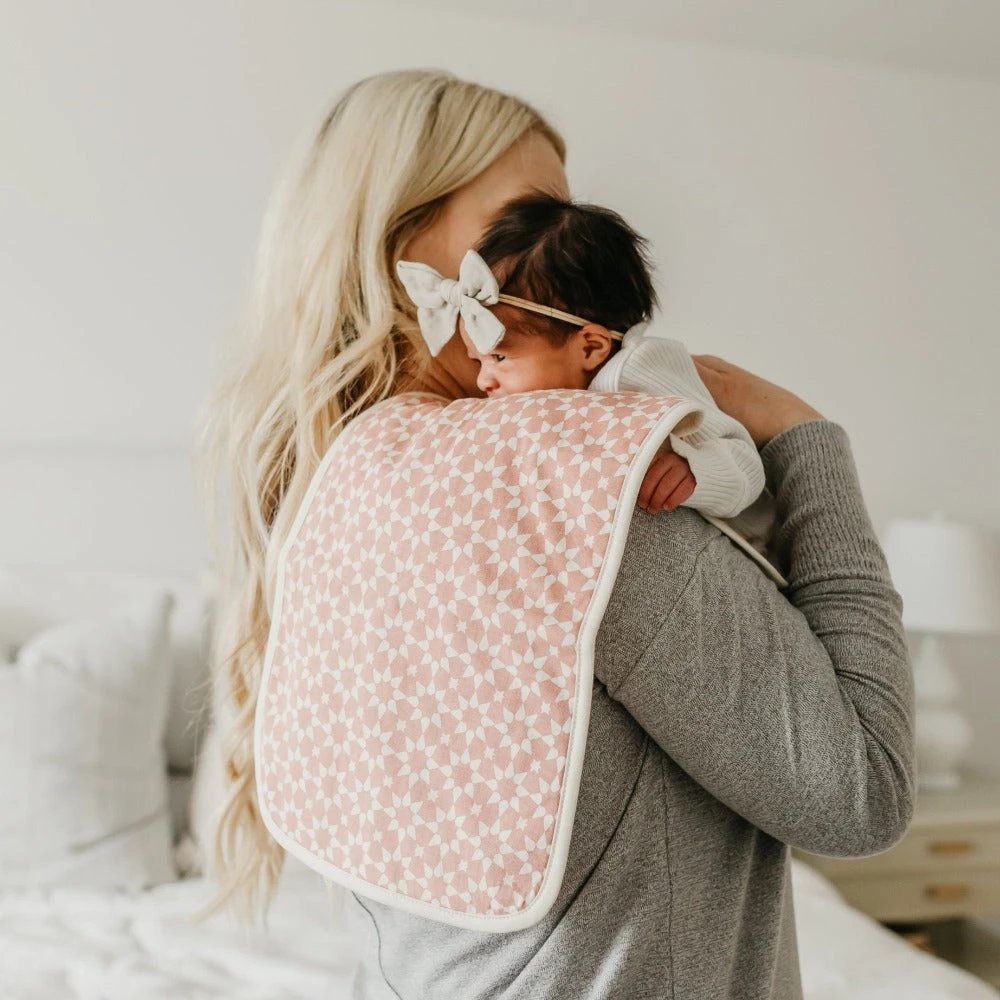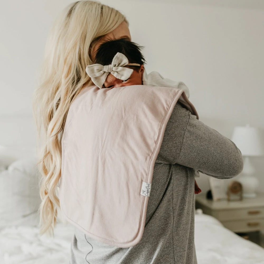 Copper Pearl’s burp cloths are designed with baby’s comfort in mind. That’s why we created them with 100% ultra-soft cotton layers on the front (patterned) and back (plain white). You can feel confident that baby will feel cozy against your shoulder while burping.