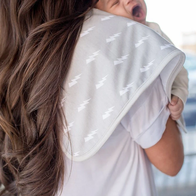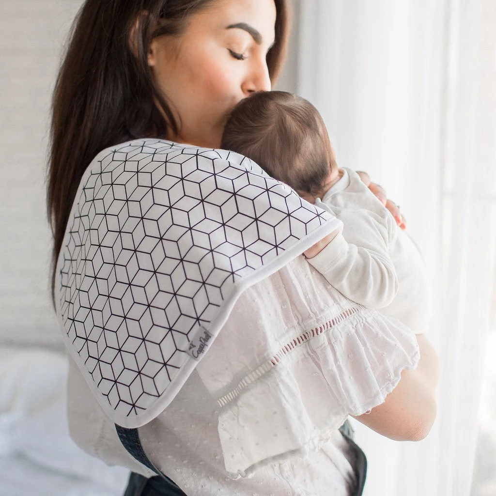 Copper Pearl’s burp cloths are designed with baby’s comfort in mind. That’s why we created them with 100% ultra-soft cotton layers on the front (patterned) and back (plain white). You can feel confident that baby will feel cozy against your shoulder while burping.